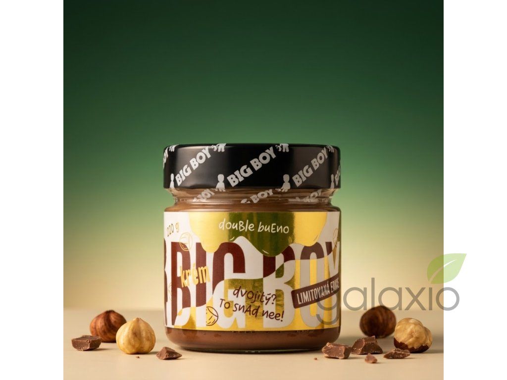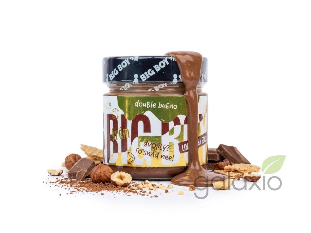 Existuje něco víc, než lahodný krém BIG Bueno? No přece Double Bueno! Tahle limitka ještě zdvojnásobí tvoji lásku k lísko-ořechovým krémům. Světlá a tmavá pochoutka v dokonalém mixu chutí. Těžko se to vysvětluje, tohle musíš zažít. Objednávej, ochutnávej! Výživové údaje na 100 g: Energetická hodnota: 2233 kJ / 536 kcal Tuky: 34 g - z toho nasycené mastné kyseliny: 3,9 g Sacharidy: 44 g - z toho cukry: 39 g Vláknina: 5 g Bílkoviny: 12 g Sůl: 0,03 g Složení: Mletá jádra lískových ořechů 50 %, třtinový cukr moučka, mléko sušené odstředěné 12,5 %, kakao 2,5 % (kakaový prášek, regulátor kyselosti: uhličitan draselný), ghí (přepuštěné máslo ). Může obsahovat stopy ostatních skořápkových plodů a arašídů. Skladování: Skladuj v suchu a nevystavuj přímému slunečnímu záření. Chraň před teplem. Po otevření spotřebuj do dvou měsíců. Použití: Ideální k dochucení sladkých pokrmů nebo k přímé konzumaci. Případná separace oleje na povrchu není na závadu, jedná se o přirozený jev. Před konzumací promíchej .Doplňkové parametry