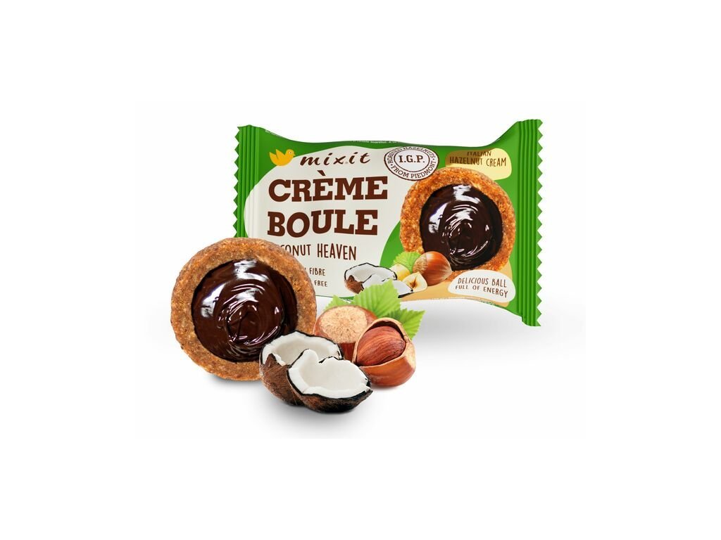 Ochutnejte Crème boule, ve francouzském překladu je to doslova krémová koule, která pod lahodnou vrstvou výběrových datlí a kokosu skrývá sametový krém z piemontských lískových oříšků. Tahle koule vám při mlsání udělá jednoduše boule až za ušima, o to se postará chuťová harmonie datlí a jemně nastrouhaného kokosu bez palmového oleje a bez zbytečných umělých přísad a chemie. Crème boule jsou dokonalým zdrojem rychlé a nebesky dobré energie, kterou můžete mít vždy po ruce.