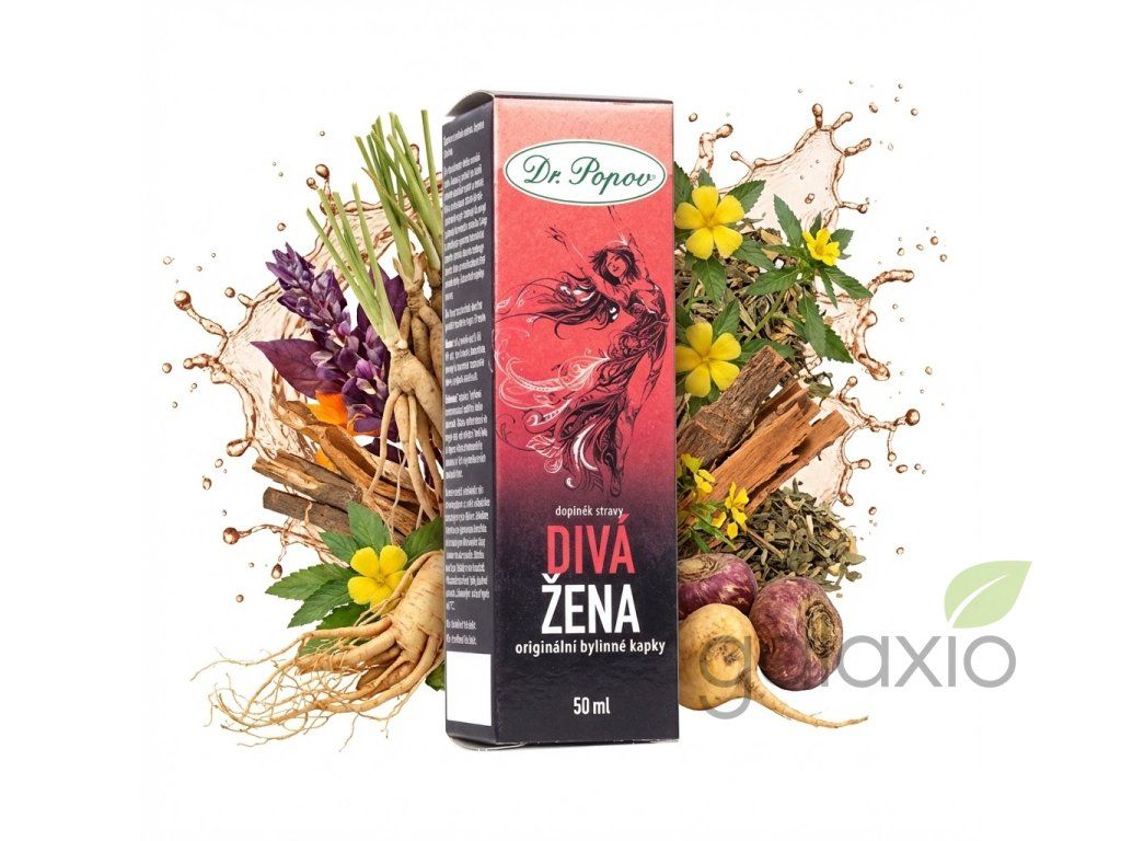 Kdy se vám budou bylinné kapky Divá žena hodit: Uvnitř každé z nás je divoška. Objevte svou vášeň, buďte nespoutaná a odvážná..Objevte svou divokou stránku s kapkami Divá žena . Žen-šen podporuje vitalitu, sexuální zdraví, zbystřuje smysly . Šatavari je vynikající pro ženský pohlavní reprodukční systém a plodnost . Maca a muira puama (známá také jako „amazonská viagra“) dodávají tělu energii, podporují hormonální rovnováhu a sexualitu . Ginkgo je vynikající pro správnou mikrocirkulaci krevního systému a kognitivní funkce , damiána podporuje sexuální zdraví a pomáhá udržovat dobré sexuální vztahy . Složení vhodně doplňuje moringa. Divá žena je tu pro každou, která chce probudit svou vnitřní energii a žít naplno. Jak bylinné kapky vyrábíme? Pečlivě vybrané atestované byliny macerujeme v jemném 60% potravinářském lihu za studena – jedná se o způsob výroby, který je generacemi ověřený jako nejlepší , protože líh je pro extrakci ideální a kapky pak mají vysokou koncentraci účinných látek. Líh navíc doplňujeme vodou, takže v kapkách působí dva činitelé a vyluhuje se tedy i více účinných látek. Využíváme odstřeďování za vysoké rychlosti otáček, abychom z bylin získali více účinných látek. Dlouhá macerace mikronizovaných (jemně rozemletých) bylin v lihu je velmi důležitá a tento proces nelze porovnávat s prostým rozmícháním extraktu. Všechny směsné bylinné kapky Dr. Popova vycházejí z originálních receptur , které zaručují vysokou účinnost výsledné tinktury. Používání bylinných kapek Dr. Popova je velmi snadné. 1 kapka na 1 kg tělesné hmotnosti na den, rozdělit na 3 dávky během dne. Tinkturu můžete nakapat i do nápoje, např. vody nebo čaje. Denní dávka 60 kapek při tělesné hmotnosti 60 kg obsahuje 19,91 mg extraktu ze všech obsažených bylin. Současné použití s antidiabetiky nebo léčivými přípravky na snížení srážlivosti krve konzultujte se svým lékařem či lékárníkem. Nepřekračujte doporučenou denní dávku. Není určeno jako náhrada pestré stravy. Výrobek není určen pro děti, těhotné a kojící ženy. Ukládejte mimo dosah dětí. Před použitím protřepat, lehký zákal není na závadu. Uchovejte v suchu při teplotě 5-25 °C. Složení: voda, jemný kvasný líh (alk. 40% obj.), ženšen kořen, šatavari kořen, moringa list, maca kořen, muira puama dřevina, ginkgo list, damiána listDoplňkové parametry