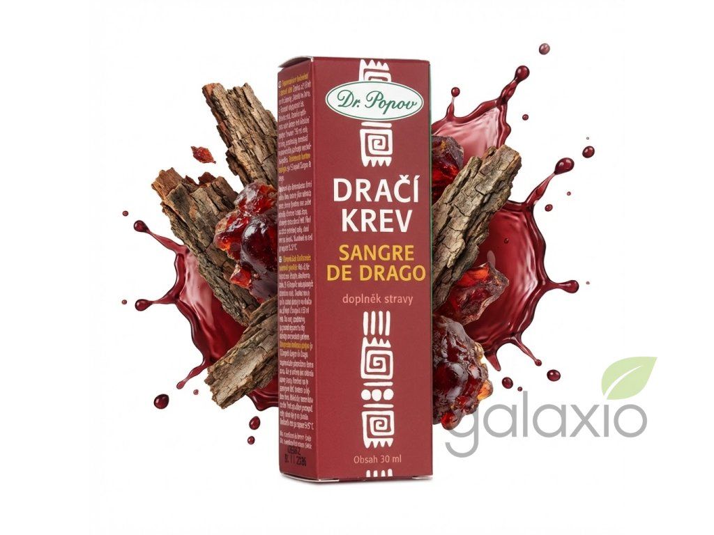Kdy se vám bude Dračí krev Dr. Popova hodit: Tento doplněk stravy se získává ze stromu Croton lechleri, ten roste hluboko v pralesích. Název Sangre de Drago neboli Dračí krev je používána proto, že míza, kterou strom vylučuje, připomíná svým vzhledem krev. Mízu strom vylučuje na svou obranu a hojení a tak se i využívala místními obyvateli. Pro svůj vysoký obsah přírodních aktivních látek jako jsou alkaloidy, flavonoly, diterpeny, taniny ( detoxikační účinky) a oligomerní prokyanidiny (ze skupiny polyfenolů-přírodní antioxidanty ) a další, je dračí krev v Peru velmi ceněna. Již po staletí je využívána k mnohým účelům. Dračí krev je výborná pro posílení imunity (díky antioxidantům) , ale také na celou řadu kožních potíží. Vnější užití na kožní problémy a poranění, poštípání hmyzem, akné, bradavice apod. – do dlaně nebo na hřbet ruky nakapejte potřebné množství dračí krve a třete prstem tak dlouho, dokud nevznikne hustá pěna, tu následně aplikujte na postižené místo. Na ráně vytvoří ochranný film, který zastaví krvácení, brání vniknutí infekce a tím se rána může rychleji zahojit. Kloktání – při problémech v ústní dutině, na dásně, zuby, mandle apod. Vnitřní užití – Dračí krev obsahuje celou řadu dalších účinných látek , které z ní činí výjimečného přírodního pomocníka se širokým spektrem pozitivních účinků na lidské zdraví, ovšem legislativa nám neumožňuje o nich zde psát. Jednou až třikrát denně užívejte, ideálně na lačno, 2-5 kapek nakapaných do sklenice vody. Zevně k výplachům ústní dutiny a ke kloktání užívejte 5 kapek v 50 ml vody. Na rány, popáleniny, kousnutí hmyzem a afty aplikujte nezředěné přímo. Nebo můžete do dlaně či na hřbet ruky nakapat potřebné množství dračí krve, třete prstem tak dlouho, dokud nevznikne hustá pěna. Tu následně aplikujte na postižené místo, kde vytvoří ochranný film, který bude účinně působit a nesteče. Nepřekračujte doporučené denní dávkování. Výrobek není vhodný pro děti, těhotné a kojící ženy. Neslouží jako náhrada pestré stravy. Ukládejte mimo dosah dětí. Před použitím protřepat, lehký zákal není na závadu. Skladujte ve tmě při teplotě 5- 25 °C. Obsah 30 ml. Doplněk stravy. Složení: 100% pryskyřice Croton lechleri Země původu: PeruDoplňkové parametry