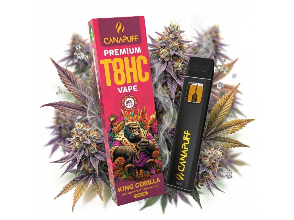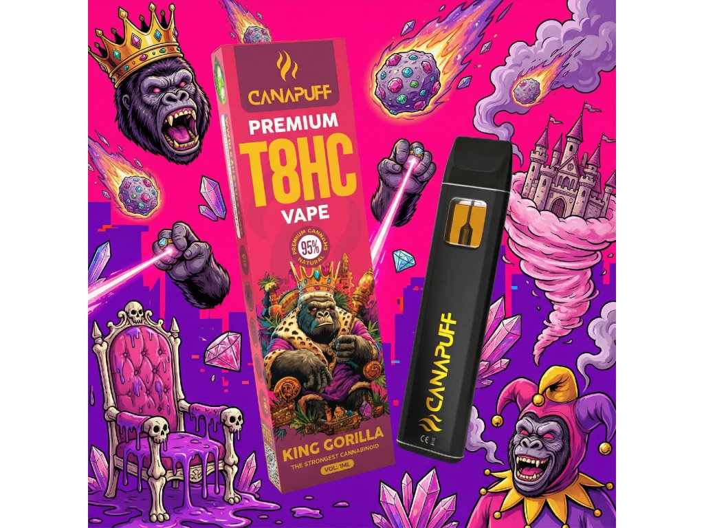 Canapuff T8HC Vape King Gorilla 1 ml je prémiový jednorázový vaporizér pro všechny, kdo chtějí zažít novou generaci konopného zážitku v maximálně pohodlné formě. T8HC (tetra‑8‑hydrokanabinol) je pokročilý kanabinoid s mimořádně vyváženým profilem – uživatelé jej popisují jako ideální kombinaci jemné euforie, hluboké relaxace, klidu a soustředění, bez zbytečného „přetížení hlavy“. Příchuť King Gorilla staví na luxusním aromatu tmavého ovoce doplněném o jemné koření a zemitý základ, takže každý potah působí plně, sametově a noblesně – jako královský rituál po náročném dni. Díky vysoké čistotě T8HC (až 95%), laboratornímu testování a výrobě v EU podle evropských norem jde o ideální volbu pro náročné uživatele, kteří chtějí spojit inovaci, styl a výkon v jednom kompaktním zařízení. Vape je nenápadný, přenosný a vhodný jako sběratelský či dekorační produkt; výrobce deklaruje obsah THC 0% (u květů do 0,2%), takže splňuje limity pro technické konopí dle informací uvedených na stránkách výrobce. King Gorilla se tak perfektně hodí pro ty, kdo hledají prémiový T8HC profil s elegantní, temně ovocnou chutí a královskou atmosférou relaxu. Produkt v souladu se zákonem §5 č. 167/1998. Určeno k účelům průmyslovým, technickým a zahradnickým. Není určeno k přímé konzumaci nebo kouření. Produkt podléhá přirozenému úbytku hmotnosti. Zákaz prodeje mladším 18-ti let. Uchovávejte mimo dosah dětí.Doplňkové parametry