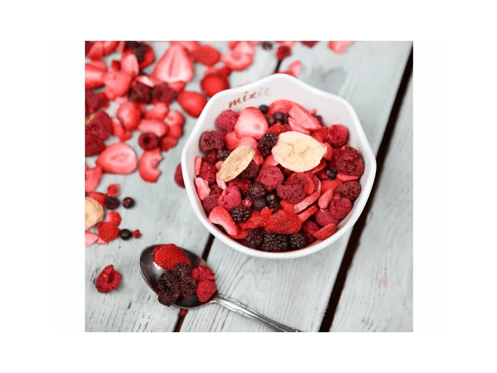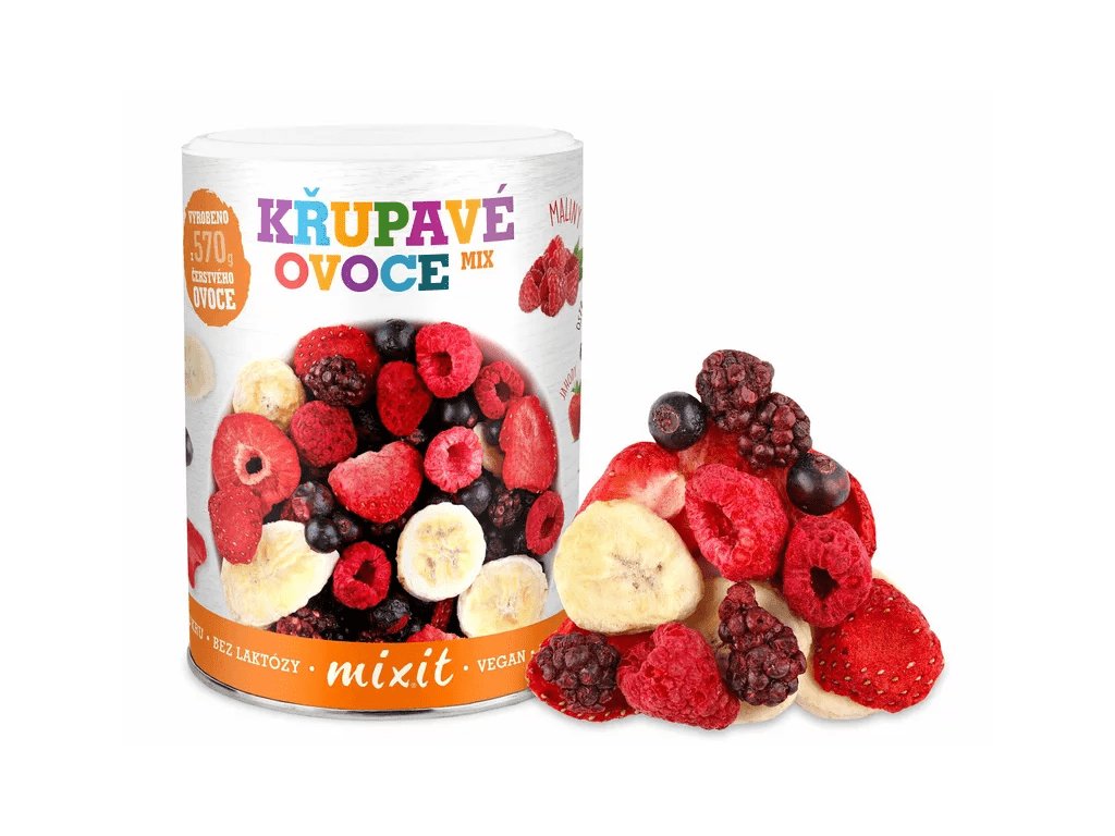 Mrazem sušené ovoce v malém tubusu. Pochutnejte si na malinách, jahodách, ostružinách, černém rybízu a banánu v jejich nejlepší formě bez použití konzervantů a dalších přísad. Chutí i voní úžasně!