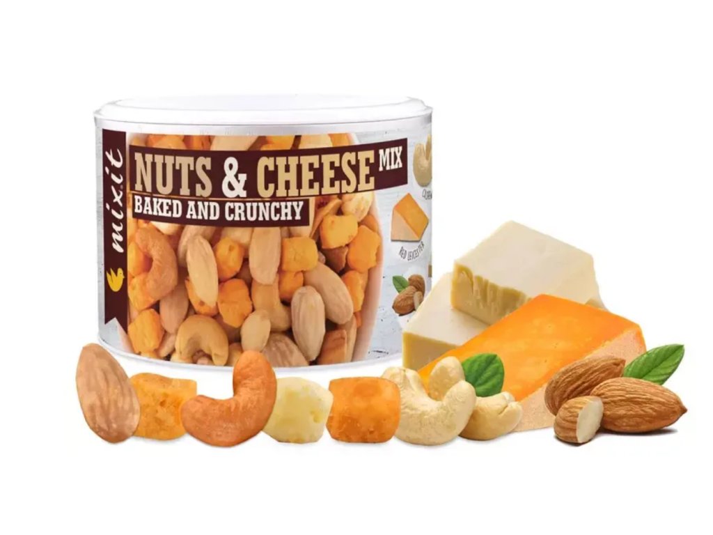 pražená jádra kešu ořechů 39,2 %, loupané mandle pražené a solené 39,2 % (mandle 98 %, jedlá sůl 1,5 %, řepkový olej 0,5 %), Red Leicester 10,8 % (pasterizované kravské mléko, jedlá sůl, mléčná startovací kultura, syřidlo, přírodní barvivo: annatto), Cheddar 10,8 % (pasterizované kravské mléko, jedlá sůl, mléčná startovací kultura, syřidlo)