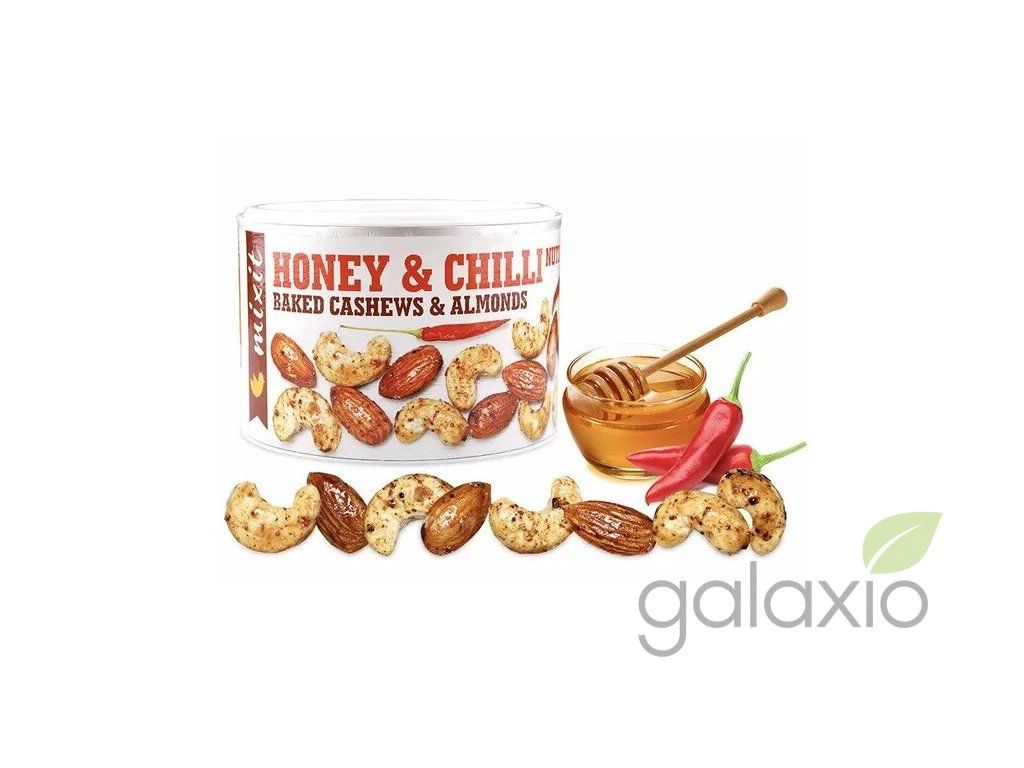 Mixit Oříšky z pece - med a chilli: Pečené dozlatova - poctivě upečené v peci Na doma - na takové to domácí zobání Bez laktózy - Mixit to umí i bez mléka Skvělé jen tak - pochutnáte si bez mléka i vody Slané - Mixit to umí i na slano Složení: jádra kešu ořechů 59 %, jádra mandlí 31 %, med 8,2 %, himálajská sůl 1,2 %, chilli mleté 0,6 % Může obsahovat stopy lepku, mléka, jiných skořápkových plodů, arašídů a sóji. Může obsahovat části skořápek. Výživové údaje na 100 g Energetická hodnota 2228.0 kJ / 532.25 kcal Tuky 42.0 g z toho nasycené mastné kyseliny 5.8 g Sacharidy 32.0 g z toho cukry 11.0 g Vláknina 6.2 g Bílkoviny 17.0 g Sůl 1.19 gDoplňkové parametry