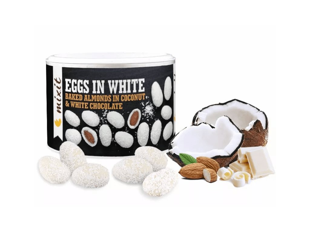 Andělsky bílá, nebesky dobrá! Splnili jsme přání milovníků kokosových vajíček a naplnili jimi celý tubus! Vychutnejte si pražené mandličky v bílé čokoládě posypané strouhaným kokosem. Chuťový zážitek nabízíme opět bez palmového oleje a umělých aromat.