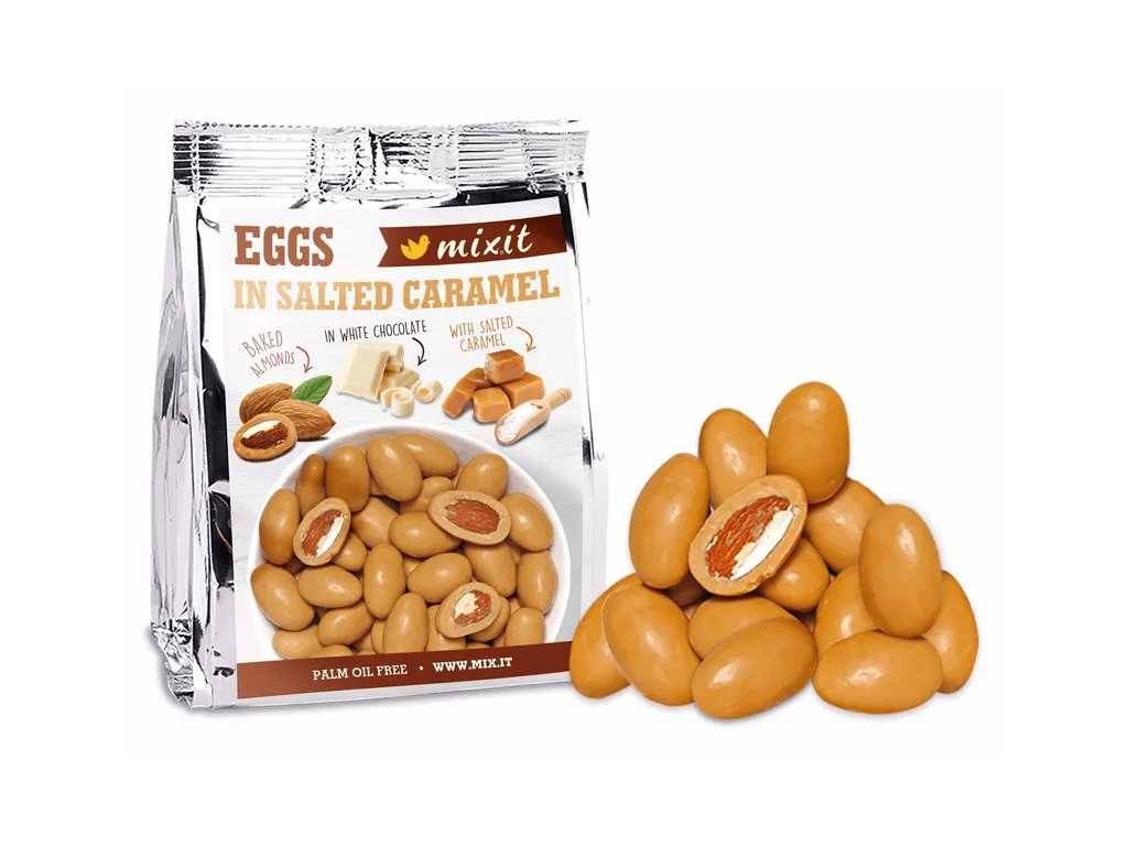 Sladká přání se špetkou soli byla vyslyšena a Mixit vajíčka jsou už i v balení do kapsy! Křupavé pražené mandličky v bílé čokoládě doslova vykoupané ve slaném karamelu jsou to pravé ořechové. Zobačka na svačinu na cesty, o kterou se nebudete chtít dělit. Dokonce i se zavřenýma očima najdete to správné vajíčko - jako vždy bez palmového oleje.