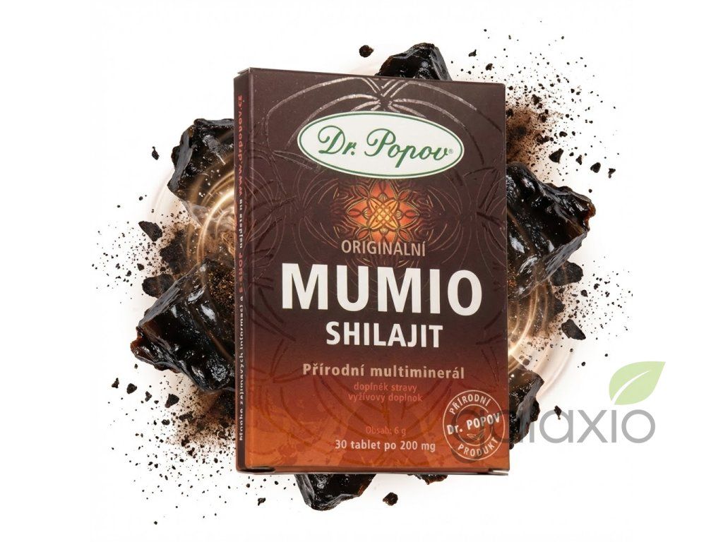 Kdy se hodí Mumio (Shilajit) Dr. Popova užívat: Originální Mumio Dr. Popova neboli Shilajit je přírodní multiminerál , který obsahuje 10 zásadních minerálů (např. vápník, draslík, hořčík), 26 stopových prvků (rubidium, cesium aj.) a další důležité aminokyseliny . Všechny účinné látky jsou ve velmi dobře vstřebatelné formě. Mumio (Shilajit) podporuje přirozenou obranyschopnost a je vhodné ho užívat zejména na podzim či jaře (v období snížené imunity) . Patří mezi nejznámější adaptogeny – látky rostlinného původu, které pomáhají tělu lépe reagovat na stres a přispívají duševní vyrovnanosti . Mumio (Shilajit) se podílí na zdravém stavu kloubů a kostí a udržuje správnou hladinu cukrů a tuků . Jsme na trhu s Mumiem již přes 30 let , máme s ním tedy ty nejdelší zkušenosti a spoustu pozitivních ohlasů od našich spokojených zákazníků. Kvalita a čistota u Mumia (Shilajitu) jsou u nás na prvním místě. U nás máte tedy jistotu, že dostáváte Mumio (Shilajit) nejvyšší kvality , důkladně testované , s certifikáty kvality a léty ověřené . Co je Mumio (Shilajit): Mumio (Shilajit) je hnědočerná charakteristicky vonící vysokohorská pryskyřice , která se v orientální medicíně užívá více než 3000 let. Od pradávna se považovalo za výjimečnou substanci, kterou znali jen vyvolení lidé. Jeho nalezištěm jsou hory v Asii, kde vytváří na stěnách a stropech jeskyň krápníky ve tvaru slz – i proto se mumiu říká „slzy skal“ nebo „zázrak z Asie“. Kde přesně se nachází, zůstává zahaleno tajemstvím. Místní sběrači mumia tyto informace tají a předávají si je z generace na generaci. Nejkvalitnější mumio pochází z oblasti Altaje, odkud ho pro vás dovážíme. Jeho zpracování je co nejšetrnější, aby zůstalo zachováno se nejvíce účinných látek. Mumio (Shilajit) má mimořádně povzbuzující, regenerační a harmonizující účinky na tělo i mysl. Další informace: Balení obsahuje 30 tablet. Místo provenience: Kyrgyzstán. 1 tabletu denně užívat při jídle po dobu 1 měsíce. Po měsíční přestávce je možno kúru zopakovat. Upozornění: Mumio není vhodné pro děti, těhotné a kojící ženy. Neužívejte ho při individuální nesnášenlivosti mumia. Mumio není vhodné pro osoby trpící močovými kameny. Neslouží jako náhrada pestré stravy. Uchovejte na suchém a tmavém místě při pokojové teplotě. Ukládejte mimo dosahu dětí. Mumio tablety jsou doplňkem stravy. Složení: přečištěné mumio 100 %Doplňkové parametry