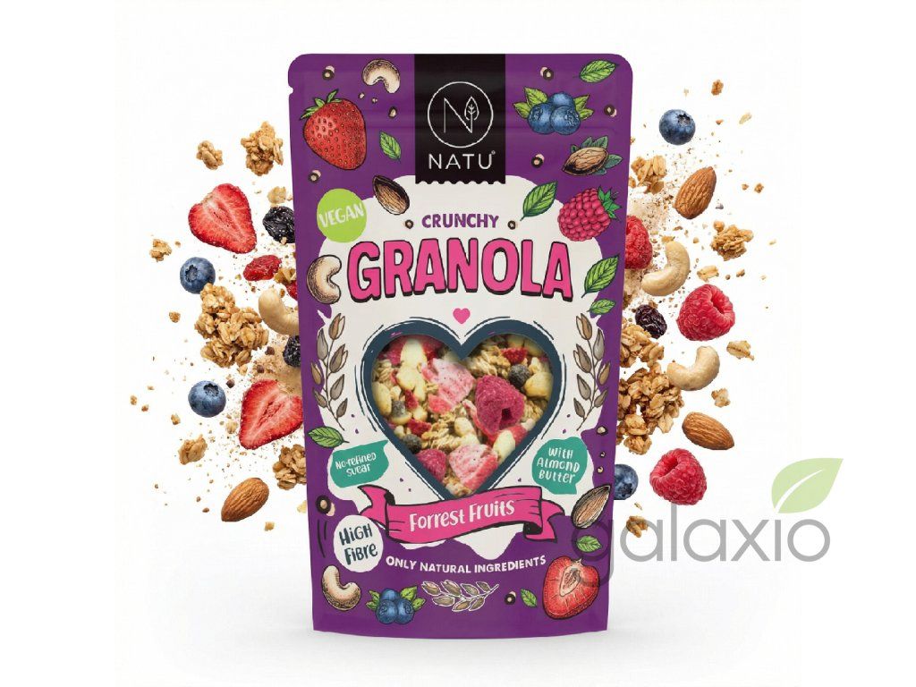 NATU Granola Lesní plody 330 g spojuje poctivý základ zapečených cereálií s pořádnou porcí lesního ovoce. Základem jsou špaldové a ovesné vločky, které se zapékají s jemným mandlovým krémem, kvalitním javorovým sirupem a trochou olivového oleje, takže vznikají velké křupavé hrudky granoly. Do základu jsou vmíchaná jádra kešu ořechů a blanšírovaných mandlí, které směsi dodávají zdravé tuky, bílkoviny a příjemnou oříškovou chuť. O opravdový „lesní“ charakter se stará 6% mrazem sušených jahod, malin a borůvek, které si díky lyofilizaci zachovávají intenzivní chuť, barvu i obsah vitamínů a dalších bioaktivních látek. Granola je 100% přírodní, bez palmového tuku, bez rafinovaného cukru a bez laktózy, slazená pouze javorovým sirupem a ovocem. Díky vysokému obsahu vloček, ořechů a semínek je bohatá na vlákninu, která podporuje trávení a pomáhá udržet delší pocit sytosti. Hodí se jako rychlá a výživná snídaně i svačina – stačí ji zalít mlékem nebo rostlinným nápojem, přidat do jogurtu s čerstvým ovocem, nasypat na smoothie bowl nebo mlsat jen tak z balíčku. Granola Lesní plody patří mezi oblíbené bestsellery značky a uspokojí všechny, kteří chtějí „granolu jako z kavárny“, ale s čistým složením bez zbytečné chemie. Složení: špaldové vločky, ovesné vločky, mandlový krém, javorový sirup, jádra kešu ořechů, jádra blanšírovaných mandlí, olivový olej, slunečnicová semena, 6% mrazem sušené ovoce (jahody, borůvky, maliny), jemná růžová himalájská sůl; může obsahovat stopy jiných skořápkových plodů.Doplňkové parametry