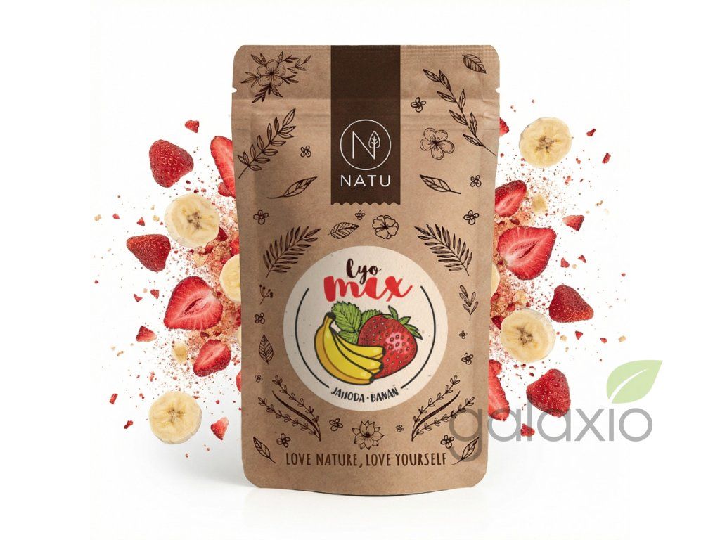 NATU Lyo mix jahoda a banán 40 g spojuje sladký, krémový banán a voňavé jahody do oblíbené lyofilizované kombinace, která boduje u dětí i dospělých. Ovoce je sušeno mrazem (lyofilizace), takže si uchovává přirozenou barvu, výraznou chuť, vůni a většinu vitamínů, minerálů a dalších prospěšných živin. Směs tvoří přibližně 67,5% mrazem sušeného banánu a 32,5% mrazem sušených jahod, bez přidaného cukru, barviv, aromat a konzervantů. Díky tomu je Lyo mix skvělou volbou pro zdravé mlsání, dětské svačiny, sportovce i všechny, kdo hledají přírodní alternativu k běžným sladkostem. Křupavé kousky jahod a banánu se hodí do bílého i rostlinného jogurtu, ovesné či jiné kaše, domácí granoly, müsli, dezertů nebo smoothie, kde dodají intenzivní ovocnou chuť i atraktivní vzhled. Lehké 40g balení je ideální do batohu, školy, práce i na výlety, takže máš vždy po ruce rychlou ovocnou svačinu bez nutnosti chlazení.Doplňkové parametry