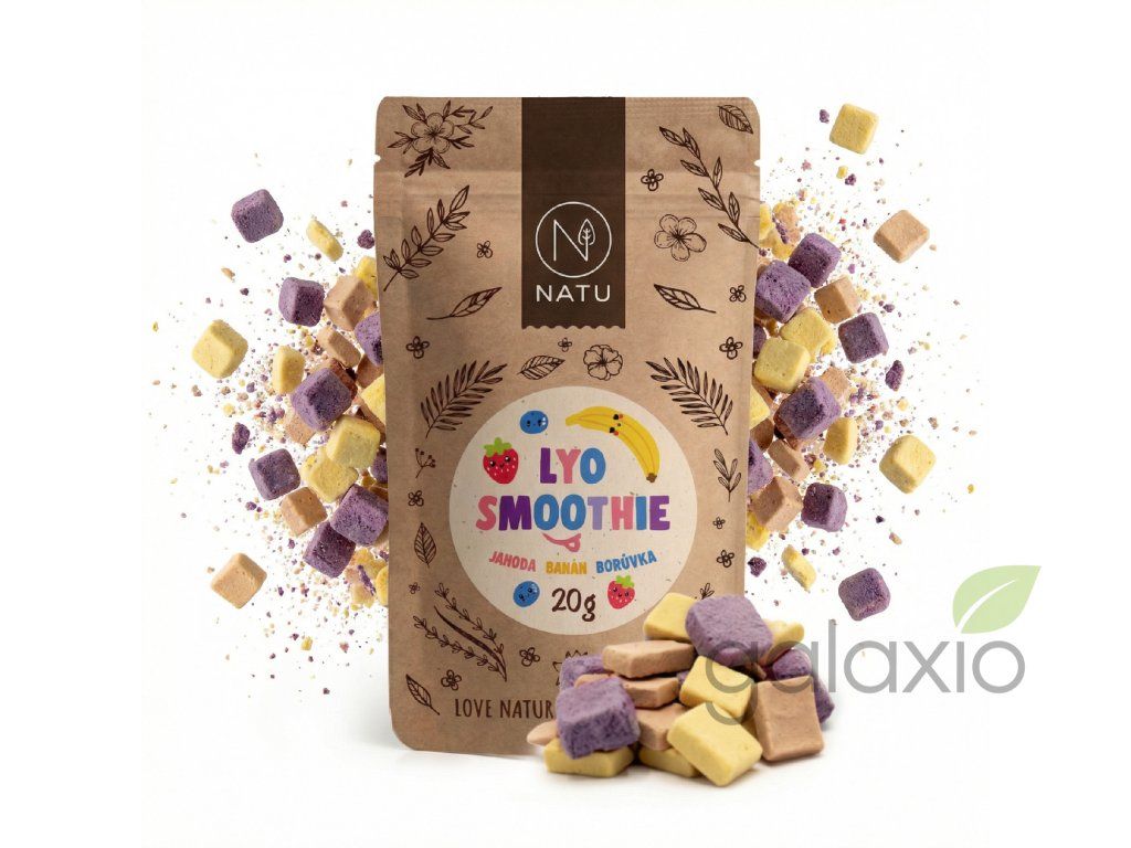 Lyo smoothie mix 20 g od NATU představuje rychlou a hravou svačinku pro nejmenší i starší děti, kterou oceníš hlavně na cestách nebo při procházkách venku. Veselé barevné čtverečky jsou křehké, voňavé, v puse se rychle rozpustí a naplno v nich vynikne přirozená chuť ovoce. Do jednoho sáčku se spojily tři druhy ovocných polštářků – banánové, jahodové a borůvkové – v harmonii chutí a barev. Čtverečky jsou vyrobené z mrazem sušeného ovocného pyré a kokosového mléka bez dodatečného doslazování, syntetických aromat, barviv, laktózy či SO2. Díky praktickému 20g balení se Lyo smoothie mix vejde do každého batohu, kabelky nebo školní aktovky a máš tak vždy po ruce porci energie z ovoce. Svačinka je vhodná pro děti od 12 měsíců a skvěle poslouží i jako křupavý doplněk do jogurtu nebo kaše, kde dodá příjemnou strukturu a ovocnou chuť.Doplňkové parametry