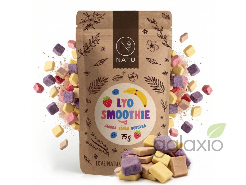 NATU Lyo smoothie mix 75 g je zdravá svačinka plná ovoce v podobě křupavých čtverečků z lyofilizovaného ovocného pyré. Díky šetrnému sušení mrazem si mix uchovává přirozenou barvu, intenzivní chuť i většinu vitamínů, minerálů a vlákniny, které bys našel v čerstvém ovoci. Barevné čtverečky jsou vyrobené ze 100% ovoce – kombinace banánového, jahodového a rybízového/borůvkového pyré, bez přidaného cukru, umělých sladidel, aromat a barviv. V jednom sáčku najdeš mix několika druhů ovocných kostiček, které se v puse doslova rozpouští a připomínají ovocné bonbony, jen v podstatně čistším složení. Lyo smoothie mix je ideální jako rychlá svačina pro děti i dospělé, na výlety, do školy, do práce nebo jako zdravější náhrada klasických bonbonů na dětské oslavy. Skvěle se hodí i jako křupavý topping do jogurtu, kaše, granoly, dezertů nebo domácího smoothie, kterému dodá výraznou ovocnou chuť a zábavnou texturu.Doplňkové parametry