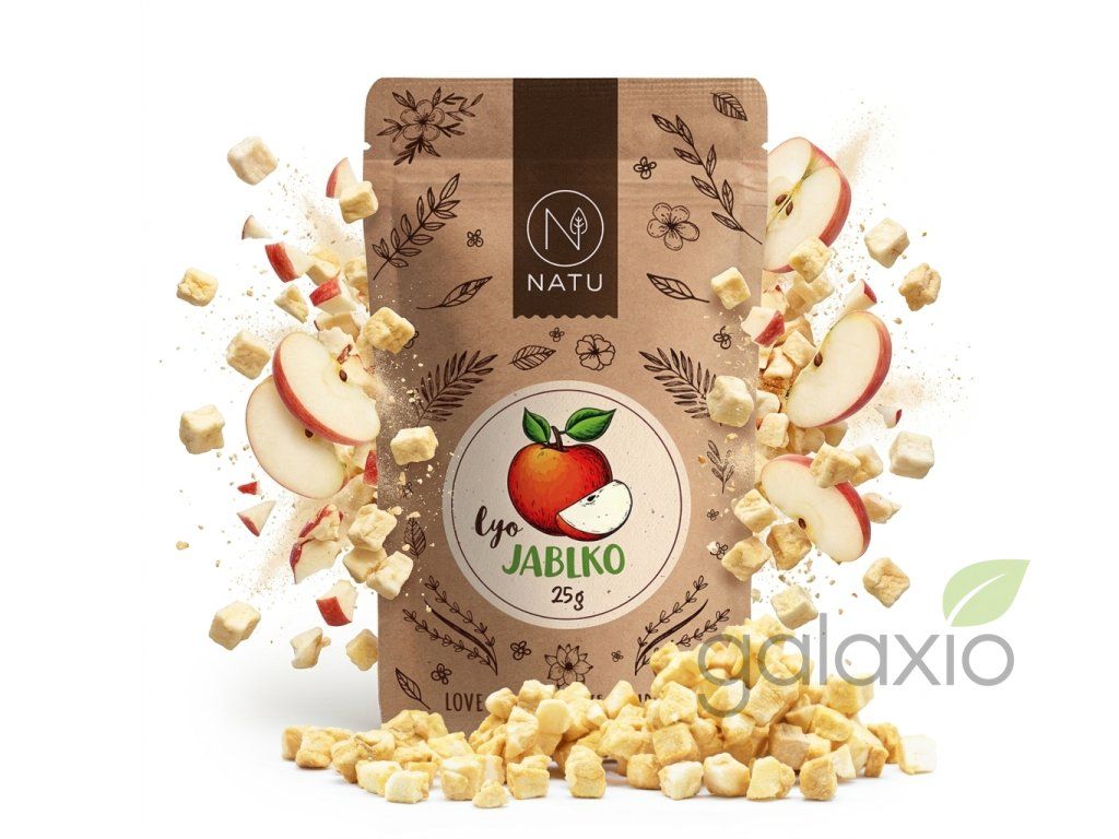 NATU Lyofilizované jablko 25g ti umožní vychutnat si chuť čerstvých jablek kdykoli a kdekoli – bez krájení, bez sušičky a bez kompromisů. Čerstvá jablka ze Slovinska jsou zbavena slupky i jádřinců, nakrájena na drobné kostičky a šetrně usušena metodou lyofilizace – sušení mrazem. Díky tomu si zachovávají svůj původní vzhled, intenzivní sladko-kyselou chuť, vůni a vysoký obsah prospěšných látek, přičemž mají zároveň mnohem delší trvanlivost než čerstvé ovoce. Lyofilizovaná jablka se pyšní vysokým obsahem vlákniny , která prospívá střevům a trávení. Jsou vhodná jako rychlá svačinka na zobání nebo jako skvělý doplněk do snídaňových kaší, granol, müsli, jogurtů, závinů i RAW dezertů, kde dodají výraznou ovocnou chuť a příjemnou křupavost. Tipy na použití: do ovesné kaše nebo müsli k snídani jako křupavá svačinka do školy nebo práce do jogurtu nebo tvarohu jako přísada do závinů a jablečných dezertů na cesty – lehoučké a dobře skladné balení Jak skladovat: Skladujte při pokojové teplotě v pečlivě uzavřeném sáčku nebo vzduchotěsné nádobě, v temnu. Správné skladování zajistí dlouhodobou křupavost. Složení: 100% mrazem sušené jablko kostky. Vegan, bez přidaného cukru, bez SO₂. Výhody produktu: 100% ovoce, jediná ingredience plná chuť zralých jablek extra křupavé kostičky vysoký obsah vlákniny vegan, bez přidaného cukru, bez SO₂ znovuuzavíratelné balení původ: SlovinskoDoplňkové parametry
