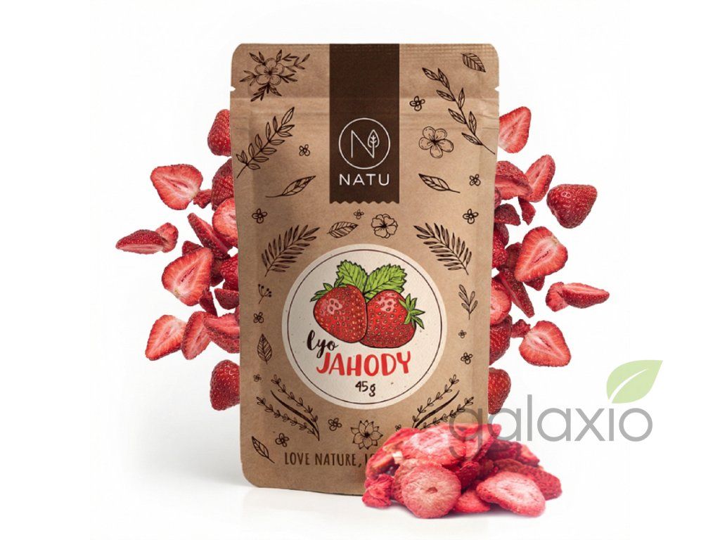 NATU lyofilizované jahody plátky 45 g umožní vychutnat si chuť zralých jahod kdykoli během roku, nezávisle na sezóně. Jahody jsou sušené mrazem (lyofilizací), takže si uchovávají až 90% původních vlastností – intenzivní vůni, výraznou chuť, sytou červenou barvu i většinu vitamínů, minerálů a antioxidantů. Křupavé plátky jahod jsou lehké, voňavé a při kontaktu s tekutinou rychle změknou a téměř se vrací do původní struktury čerstvého ovoce. Složení je 100% čisté – pouze mrazem sušené jahody v plátcích, bez přidaného cukru, lepku, laktózy, SO2, konzervantů a dalších zbytečných aditiv, takže jsou vhodné pro vegany, děti i všechny, kdo si hlídají složení. Lyofilizované jahody využiješ do snídaňových kaší, jogurtů, smoothie, RAW receptů i jako efektní zdobení dortů a dezertů, kde dodají intenzivní jahodovou chuť a krásnou barvu. Praktické 45g balení se znovu uzavíratelným sáčkem udržuje jahody křupavé a hodí se do práce, školy, na cesty i jako zdravější alternativa klasických sladkostí. Doplňkové parametry