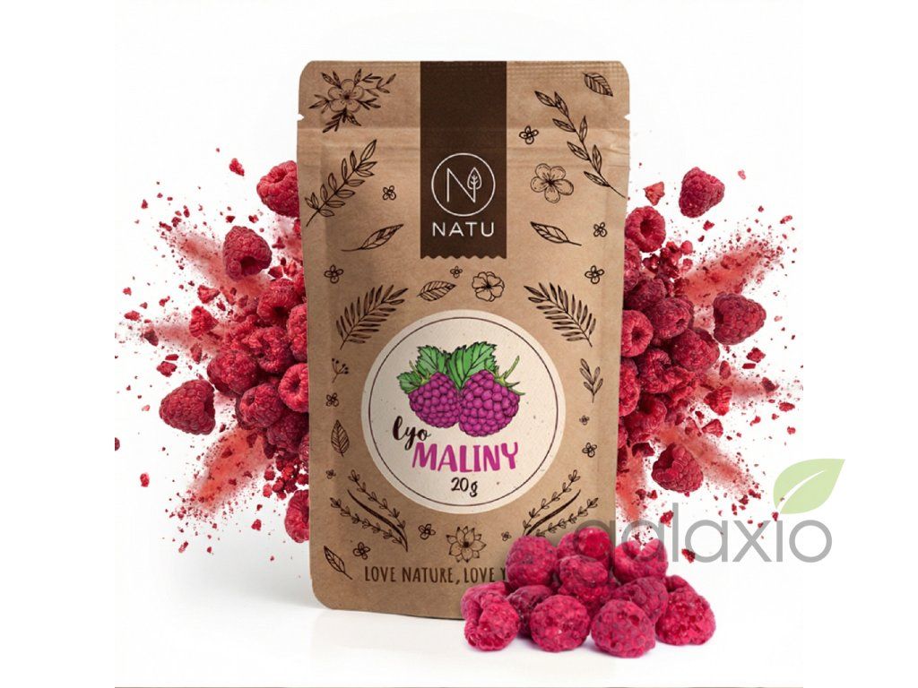 NATU lyofilizované maliny 20 g přinášejí intenzivní chuť zralých malin v praktické podobě, kterou si můžeš dopřávat kdykoli během roku. Maliny jsou sušené mrazem (lyofilizací), takže si uchovávají až 90% původních vlastností – výraznou vůni, plnou chuť, sytou barvu i většinu zdraví prospěšných látek. Mrazem sušené maliny jsou velmi lehké, krásně křupavé a při kontaktu s vodou změknou a téměř se navrací do původního stavu čerstvého ovoce. Složení je 100% čisté – pouze celé lyofilizované maliny bez přidaného cukru, lepku, laktózy, SO2 a dalších zbytečných aditiv, takže jsou vhodné pro vegany, celiaky i všechny, kdo si hlídají složení. Maliny můžeš jíst samotné jako zdravější alternativu sladkostí nebo je přidat do müsli, jogurtu, cereálních kaší, čaje, při pečení i do smoothie, kterým dodají výraznou malinovou chuť. Praktické 20g balení je ideální do kabelky, batohu či školní aktovky a díky své lehkosti se hodí na výlety, do práce i do školy. Doplňkové parametry