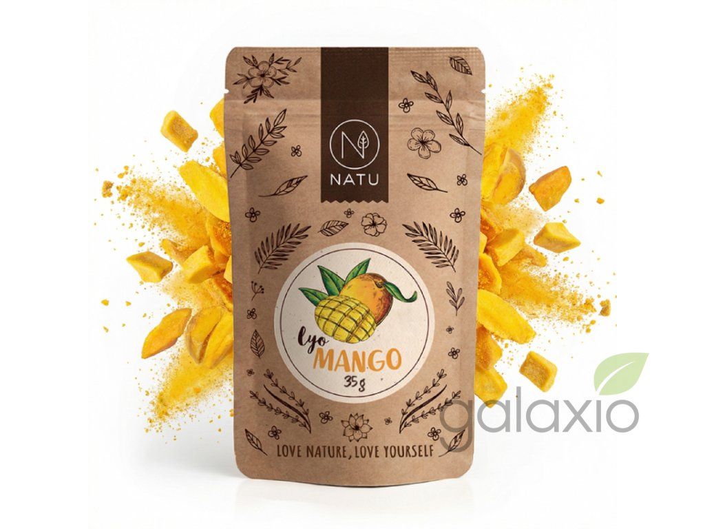NATU lyofilizované mango 35 g ti umožní užít si chuť léta v kteroukoli roční dobu díky sladkým, voňavým a dokonale křupavým kouskům manga. Ovoce je zpracováno metodou lyofilizace – sušení mrazem – takže si zachovává svůj původní vzhled, intenzivní chuť, charakteristickou vůni a vysoký obsah prospěšných látek, přičemž má zároveň mnohem delší trvanlivost než čerstvé mango. Lyo mango patří mezi nejsladší druhy lyofilizovaného ovoce NATU a skvěle se hodí jako rychlá svačina, když přijde chuť na něco sladkého, ale nechceš sahat po klasických sladkostech. Díky 100% složení – pouze mrazem sušené mango bez přidaného cukru, SO2 a dalších aditiv – je vhodné pro vegany, děti i všechny, kdo si hlídají čisté složení. Lyofilizované mango využiješ do müsli, snídaňových kaší, jogurtu, RAW receptů i jako exotický prvek do dezertů a smoothie, kde dodá výraznou ovocnou chuť a vůni. Praktické 35g balení je lehoučké, dobře skladné a ideální na cesty, do práce či školy, přičemž kousky manga zůstávají dlouho křupavé. Doplňkové parametry