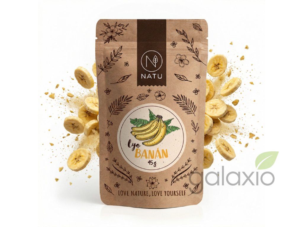 NATU lyofilizovaný banán plátky 45 g přináší oblíbenou chuť zralého banánu v praktické a dlouhodobě trvanlivé podobě. Banán je zpracován metodou lyofilizace, tedy sušení mrazem, díky čemuž si uchovává až 90% původních vlastností – výraznou vůni, přirozeně sladkou chuť, barvu i obsah zdraví prospěšných látek. Mrazem sušený banán je sladký, voňavý a krásně křupavý, přičemž při kontaktu s vodou nebo vláhou změkne a téměř se navrací do původního stavu čerstvého ovoce. Složení je 100% čisté – pouze mrazem sušený banán v plátcích, bez přidaného cukru, SO2 a dalších zbytečných aditiv, takže se hodí pro vegany i všechny, kdo si hlídají složení a chtějí mít pod kontrolou příjem cukru. Lyofilizovaný banán můžeš jíst samotný jako rychlou sladkou svačinku nebo ho přidat do smoothie, müsli, jogurtu, snídaňových kaší, čaje i při pečení. Patří mezi nejsladší lyo ovoce od NATU, má dlouhou trvanlivost a praktické 45g balení je ideální do práce, školy, na výlety i jako zdravější alternativa klasických sladkostí pro děti i dospělé. Doplňkové parametry