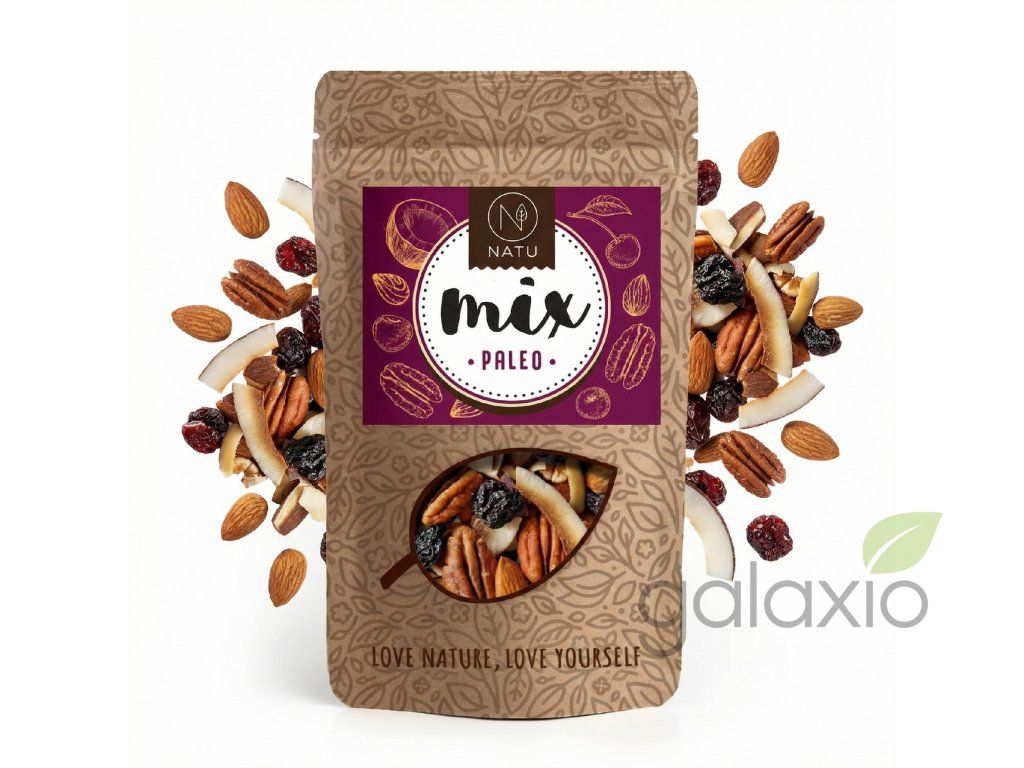 NATU Paleo mix 150 g je inspirovaný paleolitickou stravou, kdy člověk jako lovec a sběrač sahal po přirozených zdrojích energie – ořeších, semínkách a ovoci. Směs proto tvoří pouze přírodní ingredience bez přidaného cukru, soli a průmyslového zpracování, bohaté na kvalitní tuky, bílkoviny a vlákninu. V hlavní roli jsou sladké neloupané mandle a pekanové ořechy, které díky slupce přinášejí více vlákniny a mikronutrientů. Chuťově i vizuálně je doplňují křupavé kokosové plátky se slupkou z „české farmy na Srí Lance“ a šťavnaté sušené třešně ze slunných srbských sadů, které směsi dodávají ovocnou sladkost. Paleo mix je přirozeně bez lepku, bez laktózy, bez oxidu siřičitého a bez rafinovaného cukru, takže je vhodný i pro náročnější stravovací styly. Díky vysokému obsahu zdravých tuků a vlákniny zasytí na delší dobu a skvěle se hodí jako rychlý zdroj energie při sportu, na výletech, v práci i ve škole. Směs můžete mlsat samotnou, přisypat ji do jogurtu, müsli, kaše nebo smoothie bowl a jednoduše tak navýšit nutriční hodnotu celého jídla. Paleo mix se hodí i do kanceláře jako „lepší“ alternativa klasických sladkostí a slaných snacků. Složení: 31% neloupané mandle, 29% pekanové ořechy, 22% sušené třešně, 18% kokosové plátky se slupkou; vegan, bez přidaného cukru i soli.Doplňkové parametry