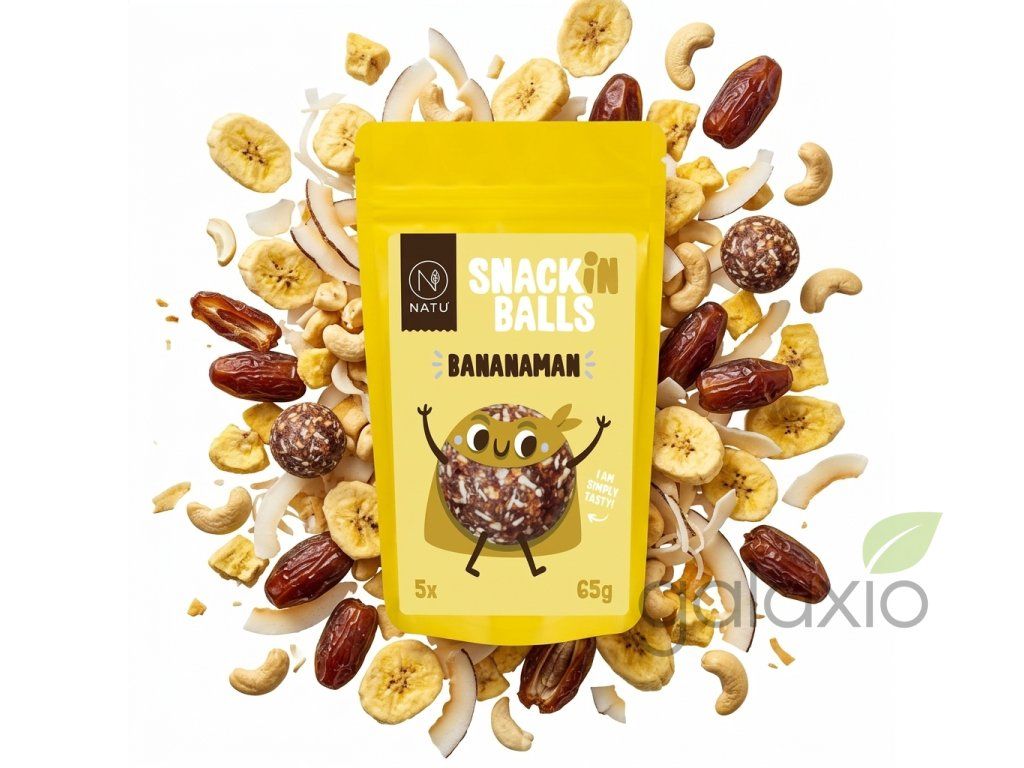 NATU SNACKin Balls Bananaman 65g ti umožní dopřát si sladkou banánovou energii kdykoli během dne – bez výčitek a bez kompromisů. Každá kulička spojuje výraznou chuť mrazem sušeného banánu , krémovost kešu oříšků , exotický nádech kokosu a přirozenou sladkost datlí . Výsledkem jsou extra měkké, vláčné kuličky, které chutnají jako domácí banánový chlebíček – jen z pouhých 4 přírodních ingrediencí a v kapesní verzi. Pro maximální zachování živin a přirozené chuti surovin je využito šetrné RAW zpracování – bez tepelné úpravy, bez přidaného cukru, bez SO₂, bez laktózy a konzervantů. Každé balení ukrývá 5 kuliček , které zachrání tvůj hlad, únavu i chuť na něco dobrého. SNACKin Balls Bananaman se hodí jako: sladká svačina bez výčitek pro děti i dospělé energie před sportem nebo po tréninku s kávou nebo čajem místo zákusku do kapsy, batohu nebo na cesty Díky 100% přírodnímu složení jsou vhodné pro vegany, děti i všechny, kdo si hlídají čisté složení. Složení: pasta z datlí, 26% kešu ořechy jádra nepražená, 8% mrazem sušený banán, 7% kokos strouhaný. Může obsahovat stopy arašídů a jiných skořápkových plodů. Výhody produktu: 100% přírodní složení ze 4 ingrediencí bez přidaného cukru, laktózy i SO₂ výrazná ovocná banánová chuť měkká, vláčná textura RAW, vegan, bez lepku 5 kuliček v balení – praktické na cestyDoplňkové parametry