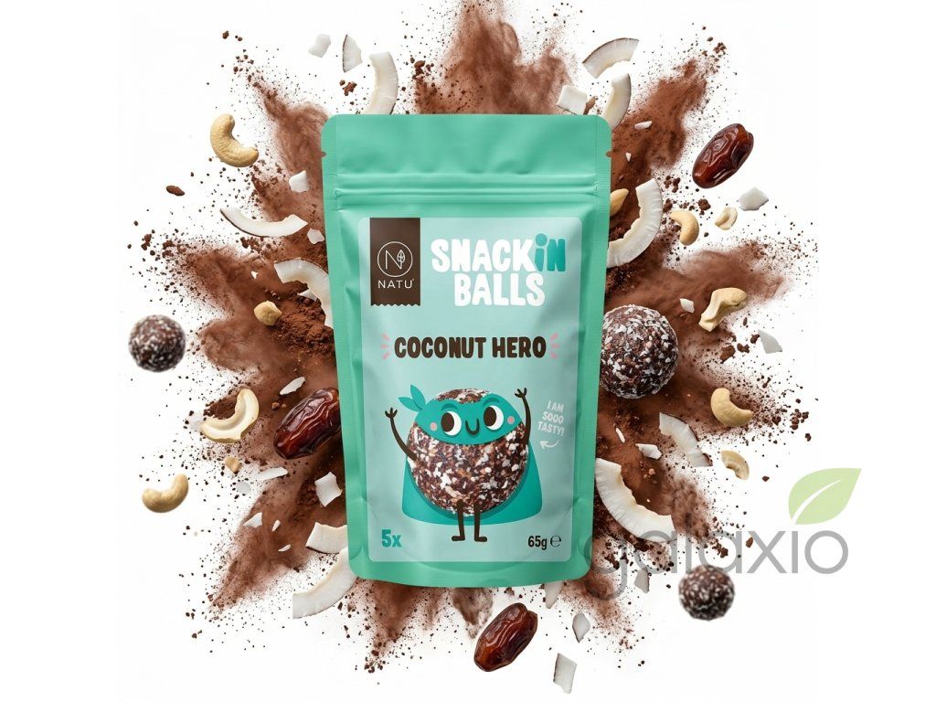 NATU SNACKin Balls Coconut Hero 65g ti umožní dopřát si mini útěk do tropů kdykoli během dne – bez výčitek a bez kompromisů. Každá kulička spojuje přirozenou sladkost datlí , exotický nádech kokosu , lehký čokoládový tón kakaa a krémovou tečku kešu oříšků . Výsledkem jsou extra měkké, vláčné kuličky, které chutnají jako tropický dezert, ale obsahují pouze 4 přírodní ingredience . Pro maximální zachování živin a přirozené chuti surovin je využito šetrné RAW zpracování – bez tepelné úpravy, bez přidaného cukru, bez SO₂, bez laktózy a konzervantů. Každé balení ukrývá 5 kuliček , které zachrání tvůj hlad, únavu i chuť na něco dobrého. SNACKin Balls Coconut Hero se hodí jako: ranní start ke kávě rychlá svačina během dne doplnění energie před i po tréninku praktický snack na výlety, do školy i do práce Díky 100% přírodnímu složení jsou vhodné pro vegany, děti i všechny, kdo si hlídají čisté složení. Složení: pasta z datlí, 28% kokos strouhaný, 11% kešu ořechy jádra nepražená, 6% kakaový prášek se sníženým obsahem tuku. Může obsahovat stopy arašídů a jiných skořápkových plodů. Výhody produktu: 100% přírodní složení ze 4 ingrediencí bez přidaného cukru, laktózy i SO₂ jemná kokosovo-čokoládová chuť měkká, vláčná textura RAW, vegan, bez lepku 5 kuliček v balení – praktické na cestyDoplňkové parametry