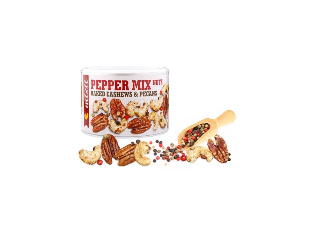Rozpálili jsme pec a pořádně vám to opepřili! K pečení dozlatova a dokřupava jsme zvolili mix kešu a pekanových ořechů, které v naší peci lahodně zkřehnou a každé sousto je tak opravdovým požitkem. Milovníkům pepře dáme rovnou čtyři důvody k radosti - červený, zelený, černý a bílý. Růžová sůl naše umělecké dílo korunuje. Tuhle dobrotu si zamilujete.