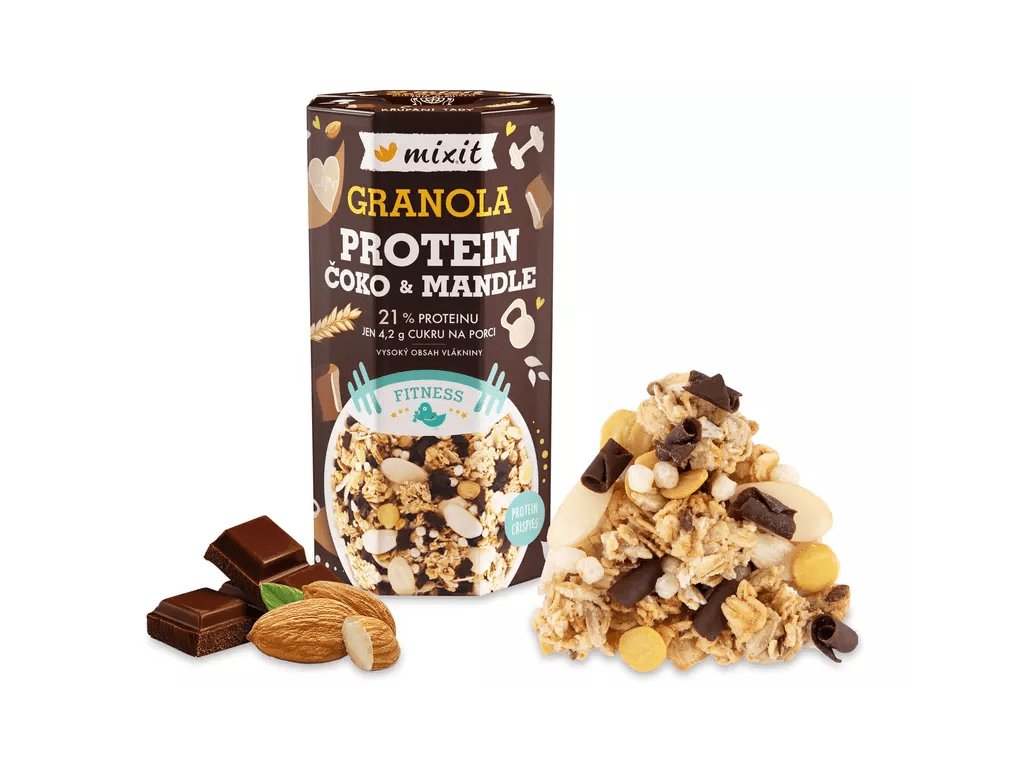 Vytáhli jsme z pece dobrotu plnou proteinů a čokolády. Představujeme vám křehkou medovou granolu s kvalitním syrovátkovým proteinem ve formě křupavých crispies. Hoblinky hořké čokolády a plátky mandlí vás po ránu nastartují raz dva. Ideální pro všechny, kteří chtějí být fit, a zároveň odmítají žít bez čokolády. Jak zpívá Dáda Patrasová – čoko, čoko, klap, klap, nebuď přece srab, srab, dej si taky s námi čokoládu!