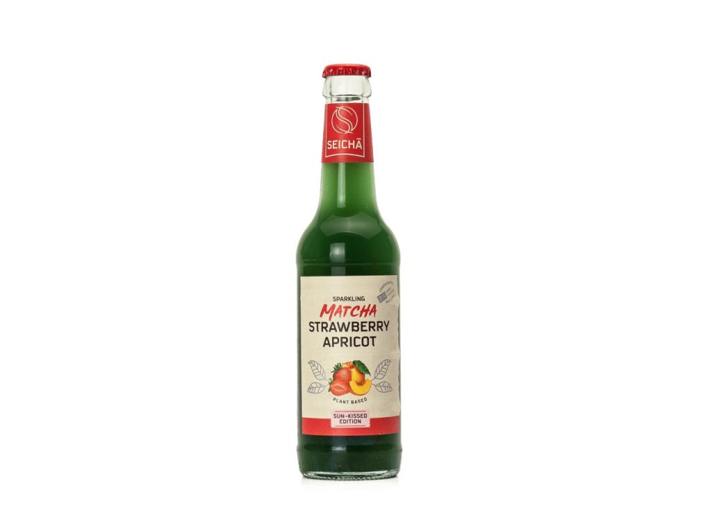 Letní edice perlivé limonády s příchutí jahody a meruňky v kombinaci s matchou.