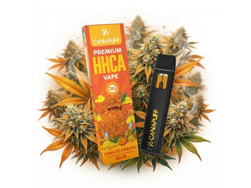 Canapuff HHC-A Vape Pen Tangie Dream 79% přináší živý mix pomerančové kůry, šťavnatých citrusů a čerstvých zahradních květů, který z každého potahu dělá malý „slunečný“ rituál. Tangie Dream kombinuje klasický citrusový charakter s jemně kyselou vůní a náznakem borovice a benzínu, takže chutná jako spojení pomerančové limonády, lesního vzduchu a květinového trhu. Uvnitř pera se ukrývá 79% HHC-A (Hexahydrocannabinol Acetate), moderní kanabinoid s vyváženým, euforickým účinkem, který sedí někde mezi HHC a THC – povznášející, ale ne přehnaný. Tangie Dream je ideální na povzbuzení dne, kreativní flow i social chill, kdy chceš cítit energii a dobrou náladu, ale stále mít nad situací kontrolu. Jednorázové pero má objem 1 ml a baterii dimenzovanou přibližně na 450 potahů; pokud se vybije dříve než náplň, jednoduše ho dobiješ přes USB-C konektor. Zařízení je plně připravené k použití – žádné nastavování, žádné výměny cartridgí, prostě vzít, potáhnout, užít si Tangie Dream a po vypotřebování náplně pero bezpečně zlikvidovat. Canapuff Tangie Dream 79% HHC-A patří do řady prémiových HHC-A vapů s laboratorně testovaným obsahem a důrazem na výrazný terpenový profil. Pokud hledáš svěží citrusovou příchuť s květinovým tvistem, moderní formu HHC-A a diskrétní sběratelský kousek, Tangie Dream je přesně ten „slunečný“ vape pen, který ti rozzáří běžný den. Produkt v souladu se zákonem §5 č. 167/1998. Určeno k účelům průmyslovým, technickým a zahradnickým. Není určeno k přímé konzumaci nebo kouření. Produkt podléhá přirozenému úbytku hmotnosti. Zákaz prodeje mladším 18-ti let. Uchovávejte mimo dosah dětí.Doplňkové parametry