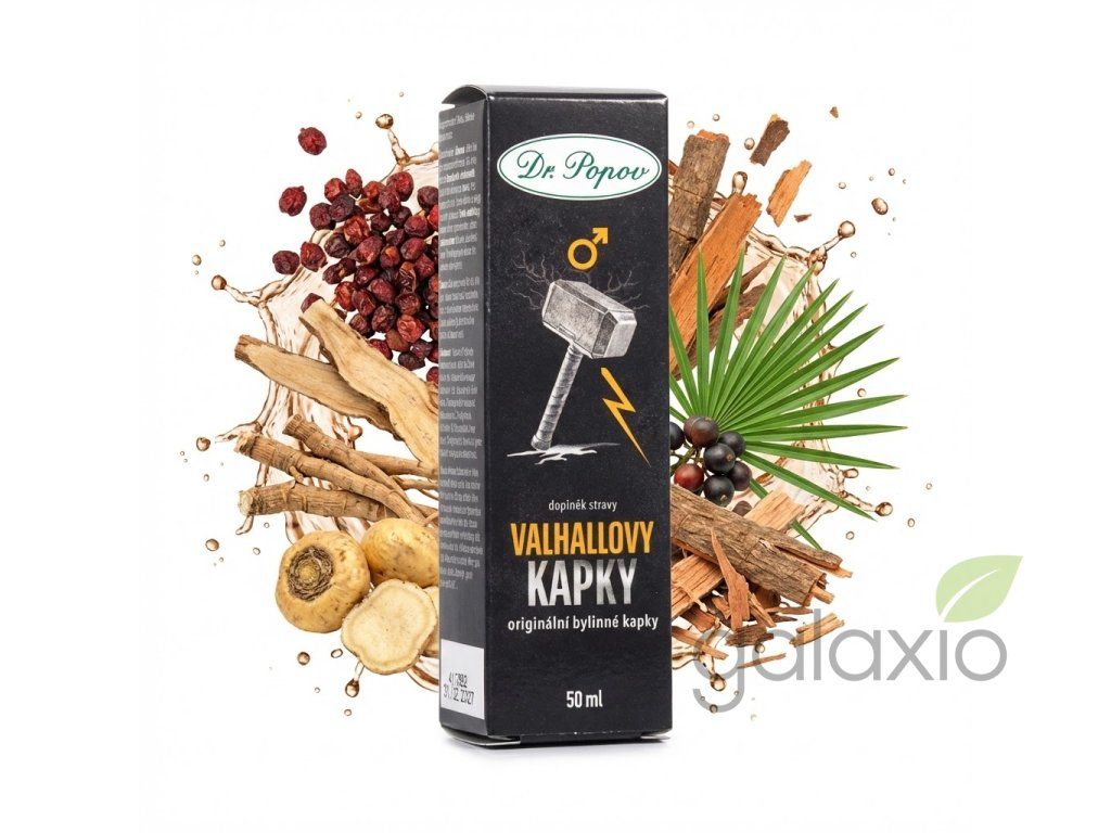 Kdy se vám budou bylinné Valhallovy kapky hodit: Originální bylinná tinktura Dr. Popova Valhallovy kapky byly vyrobené ve spolupráci se známými influencery, cestovateli a milovníky bylin Valhallou a Ježíšem . Základem kapek je škornice , někdy také nazývána „ bylina prostopášného kozla. “ Její účinky podtrhují bylinky tongkat ali a eleuterokok . Další obsaženou bylinou je maca , která podporuje fyzické, duševní i sexuální zdraví a zvyšuje vytrvalost a plodnost . Palma sabalová pro normální funkce reprodukčního systému a prostaty a muira puama nebo také „ amazonská viagra, “ která funguje jako tonikum pro podporu fyzické kapacity. Valhallovy kapky podpoří mužské zdraví, jejich sexualitu, energii, vitalitu, výdrž a v neposlední řadě dobrou náladu . Hodí se i pro ženy k vyrovnání hormonální hladiny a pro dobré fyzické a sexuální zdraví . Jak bylinné kapky vyrábíme? Pečlivě vybrané atestované byliny macerujeme v jemném 60% potravinářském lihu za studena – jedná se o způsob výroby, který je generacemi ověřený jako nejlepší , protože líh je pro extrakci ideální a kapky pak mají vysokou koncentraci účinných látek. Líh navíc doplňujeme vodou, takže v kapkách působí dva činitelé a vyluhuje se tedy i více účinných látek. Využíváme odstřeďování za vysoké rychlosti otáček, abychom z bylin získali více účinných látek. Dlouhá macerace mikronizovaných (jemně rozemletých) bylin v lihu je velmi důležitá a tento proces nelze porovnávat s prostým rozmícháním extraktu. Všechny směsné bylinné kapky Dr. Popova vycházejí z originálních receptur , které zaručují vysokou účinnost výsledné tinktury. Používání bylinných kapek Dr. Popova je velmi snadné. 1 kapka na 1 kg tělesné hmotnosti na den, rozdělit na 3 dávky během dne. Tinkturu můžete nakapat i do nápoje, např. vody nebo čaje. Denní dávka 60 kapek při tělesné hmotnosti 60 kg obsahuje 55,75 mg extraktu ze škornice, 27,87 mg extraktu z macy a po 13,74 mg extraktu z tongkat ali, palmy sabalové, muira puama a eleuterokoku. Doporučená denní dávka doplňku stravy nesmí vést k příjmu vyššímu než množství ekvivalentnímu 500 mg sušeného dřeva muira puama. Nepřekračujte doporučenou denní dávku. Není určeno jako náhrada pestré stravy. Výrobek není určen pro děti, těhotné a kojící ženy. Ukládejte mimo dosah dětí. Před použitím protřepat, lehký zákal není na závadu. Uchovejte v suchu při teplotě 5-25 °C. Složení: voda, jemný kvasný líh (alk. 40% obj.), škornice šípolistá nať, maca horská kořen, tongkat ali kořen, serenoa plazivá (palma sabalová) plod, muira puama dřevina, eleuterokok kořenDoplňkové parametry