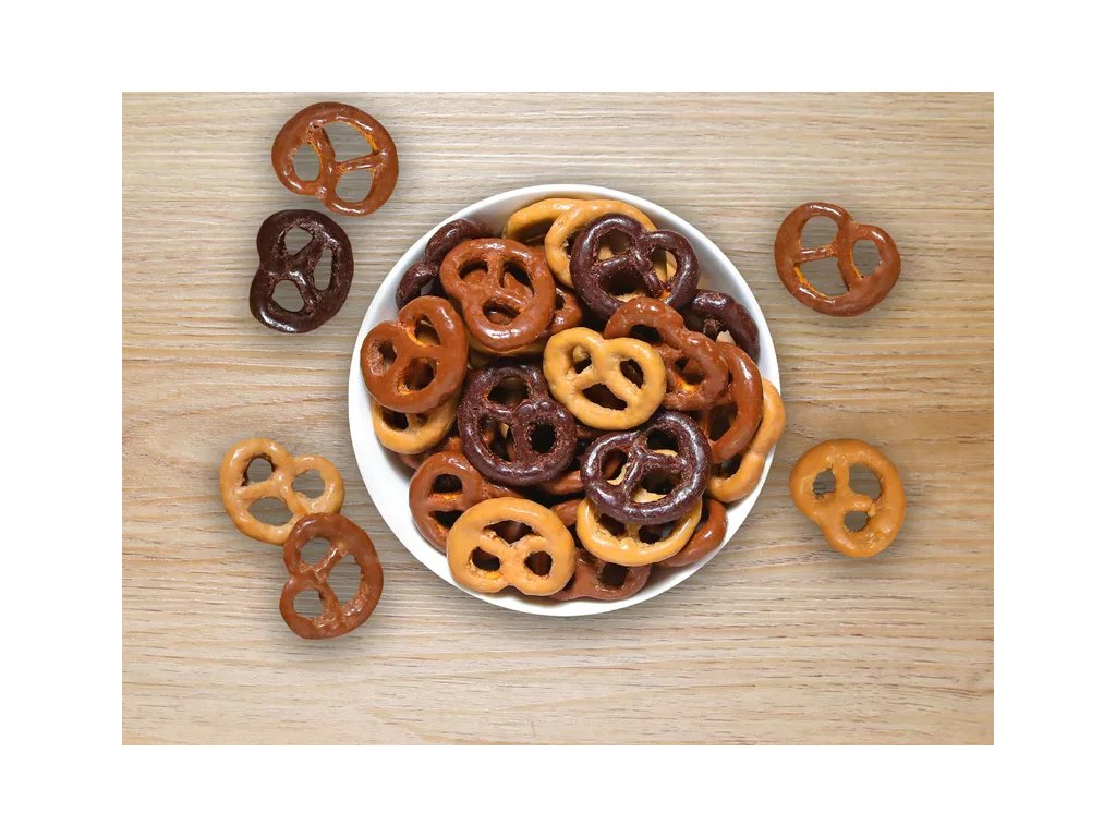 Mix slaných preclíků v bílé čokoládě se slaným karamelem, v hořké a mléčné čokoládě