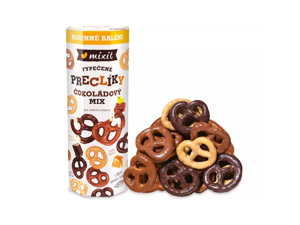 Do mixu za sebou tři preclíky jdou! Nejdřív si ale dají čokoládovou koupel. Pro naše vypečené preclíky jsme vybrali lázeň z mléčné a hořké čokolády a nechyběla ani lázeň z bílé čokolády se slaným karamelem. Kdo si láme hlavu, jaký preclík zvolit, je pro něj náš čokoládový mix preclíků ten pravý. Naše Mixit preclíky neobsahují žádná umělá sladidla, umělá aromata ani palmový olej.